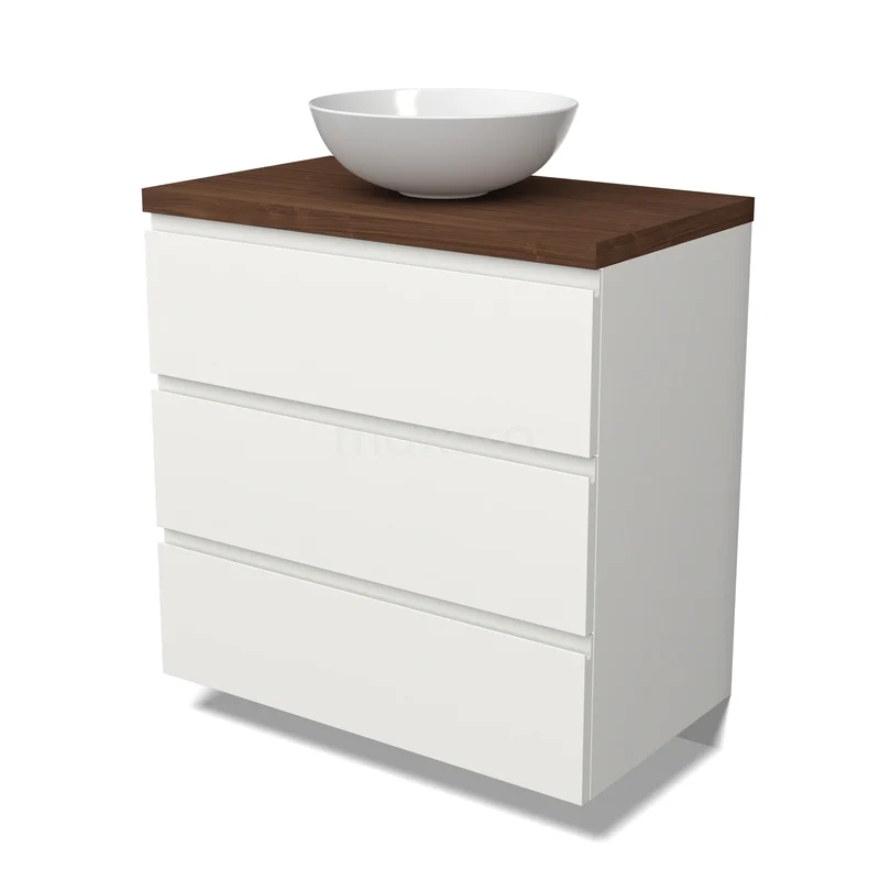 Modulo Plato Badmöbel mit Aufsatzwaschbecken | 80 cm Matt Weiß Grifflos front Walnuss blatt 3 Schubladen