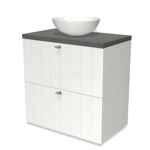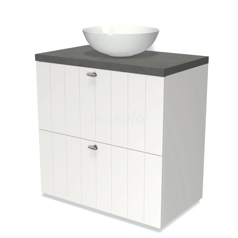 Modulo Plato Badmöbel mit Aufsatzwaschbecken | 80 cm Matt Weiß Lamelle front Dunkelgrauer Beton blatt 2 hohe Schubladen übereinanderliegend