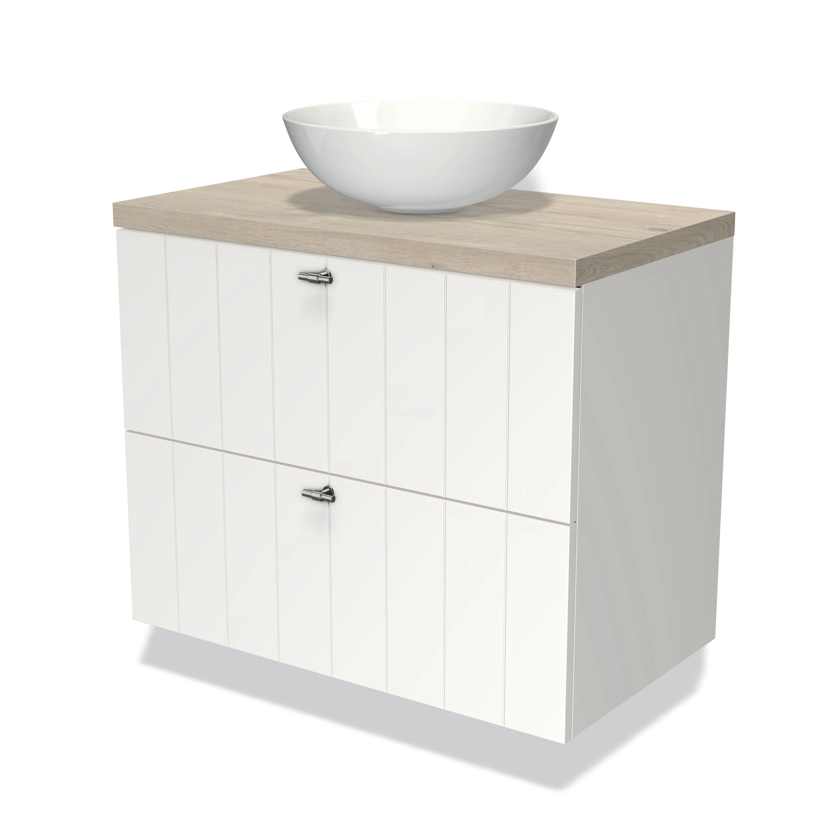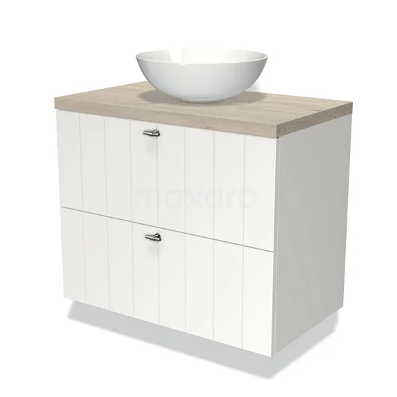 Modulo Plato Badmöbel mit Aufsatzwaschbecken | 80 cm Matt Weiß Lamelle front Hellgraue Eiche blatt 2 übereinanderliegende Schubladen