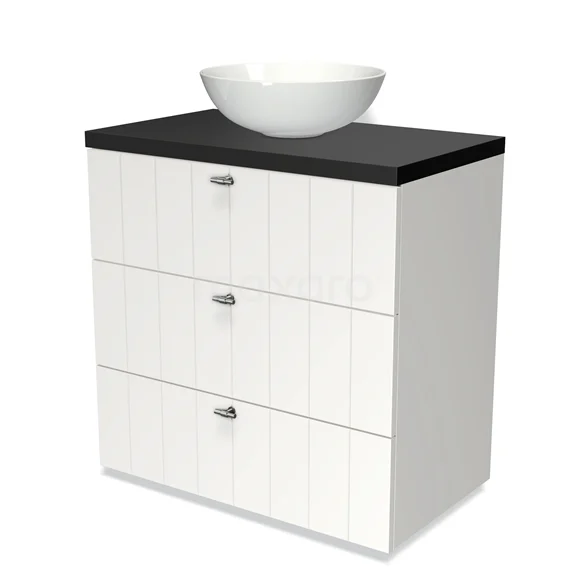 Modulo Plato Badmöbel mit Aufsatzwaschbecken | 80 cm Matt Weiß Lamelle front Matt Schwarz blatt 3 Schubladen