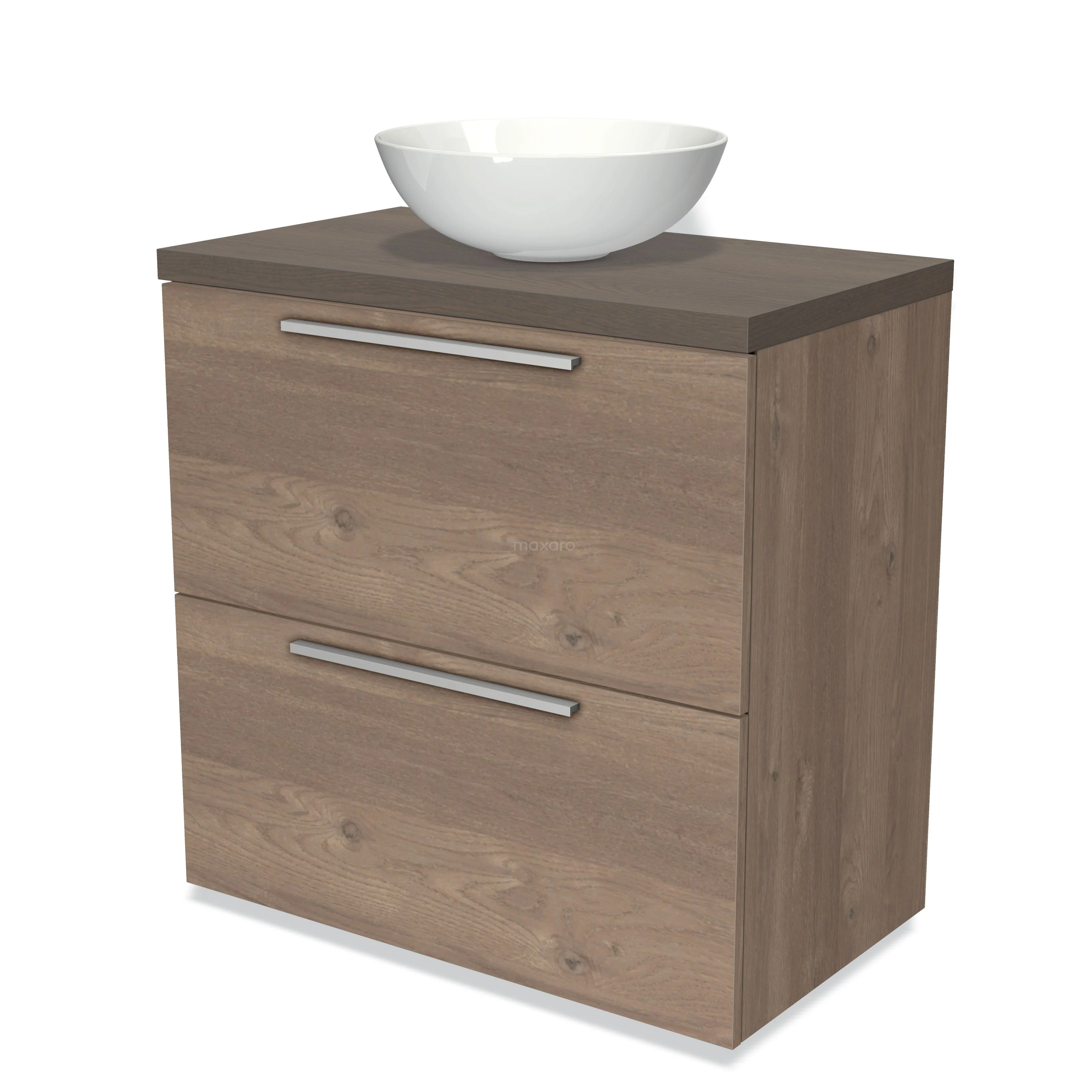 Modulo Plato Badmöbel mit Aufsatzwaschbecken | 80 cm Mittelbraune Eiche Flach front Dunkelbraune Eiche blatt 2 hohe Schubladen übereinanderliegend