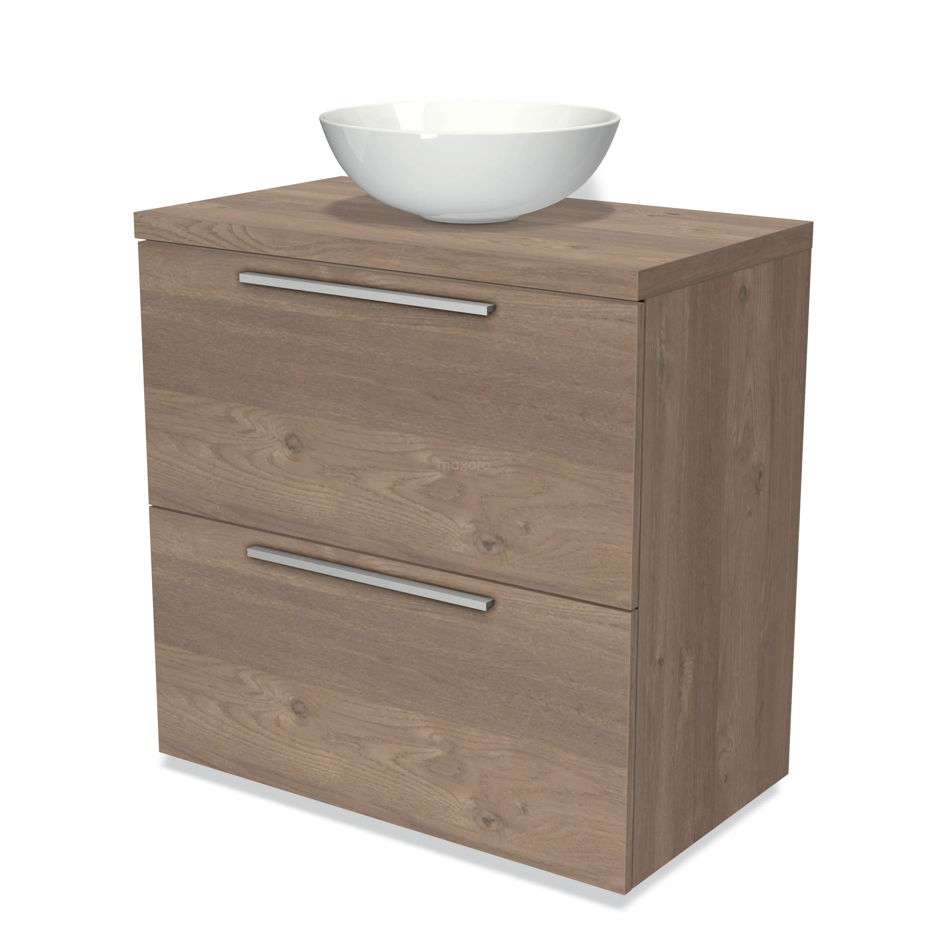 Modulo Plato Badmöbel mit Aufsatzwaschbecken | 80 cm Mittelbraune Eiche Flach front Mittelbraune Eiche blatt 2 hohe Schubladen übereinanderliegend