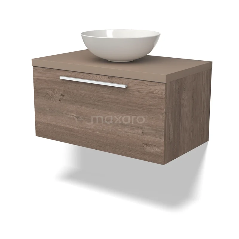 Modulo Plato Badmöbel mit Aufsatzwaschbecken | 80 cm Mittelbraune Eiche Flach front Taupe blatt 1 Schublade