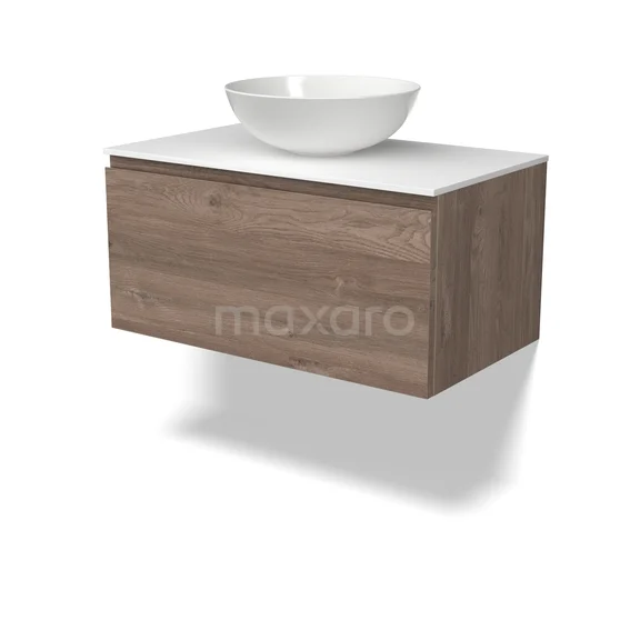 Modulo Plato Badmöbel mit Aufsatzwaschbecken | 80 cm Mittelbraune Eiche Grifflos front Solid Surface blatt 1 Schublade