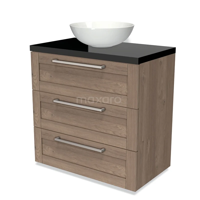 Modulo Plato Badmöbel mit Aufsatzwaschbecken | 80 cm Mittelbraune Eiche Rahmen front Hochglanz Schwarz blatt 3 Schubladen