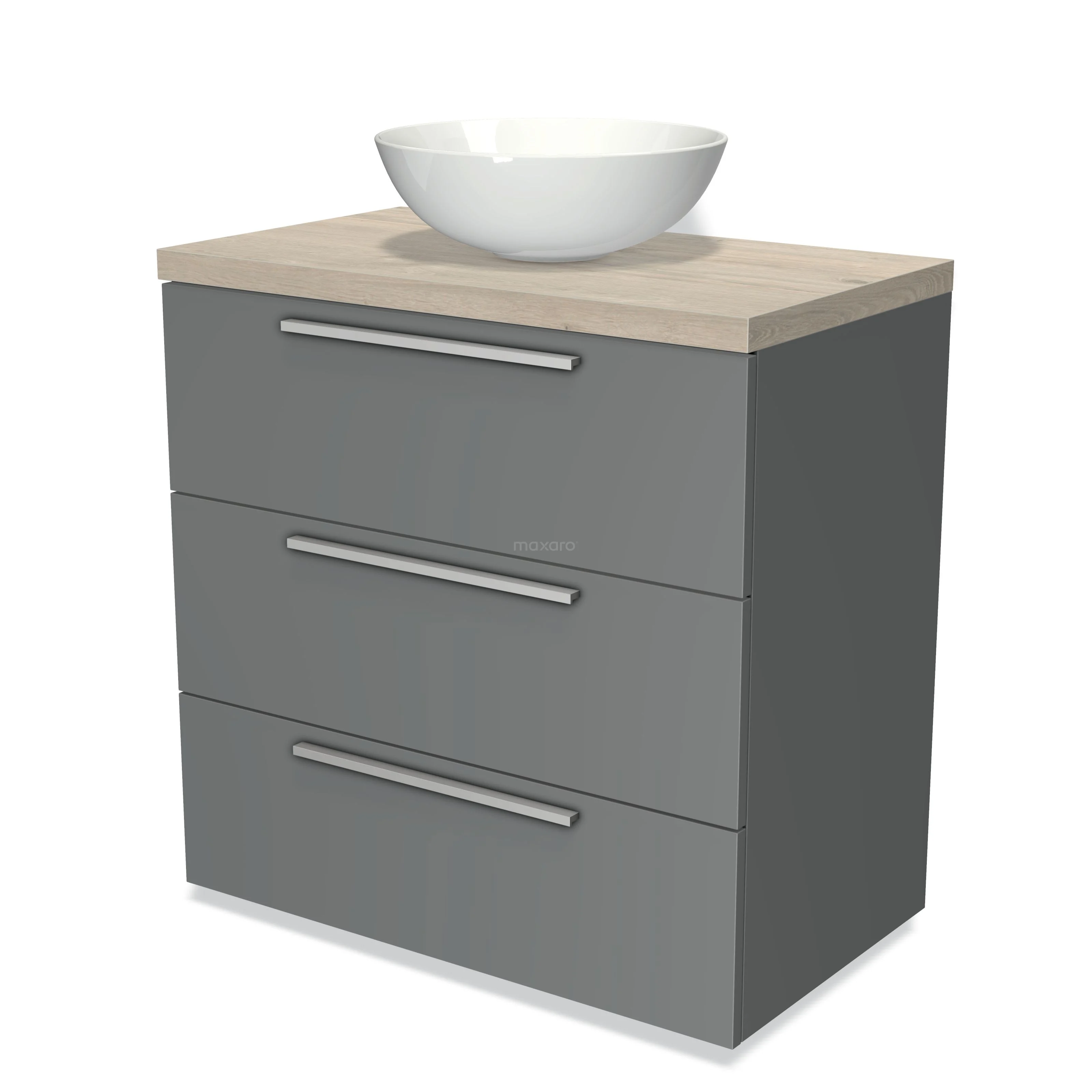 Modulo Plato Badmöbel mit Aufsatzwaschbecken | 80 cm Mittelgrau Flach front Hellgraue Eiche blatt 3 Schubladen
