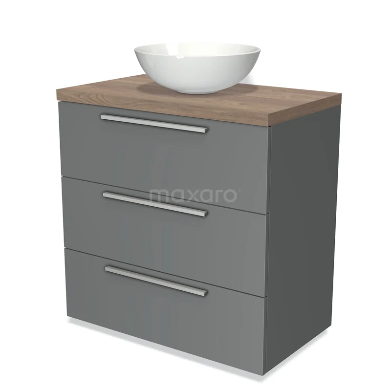 Modulo Plato Badmöbel mit Aufsatzwaschbecken | 80 cm Mittelgrau Flach front Mittelbraune Eiche blatt 3 Schubladen