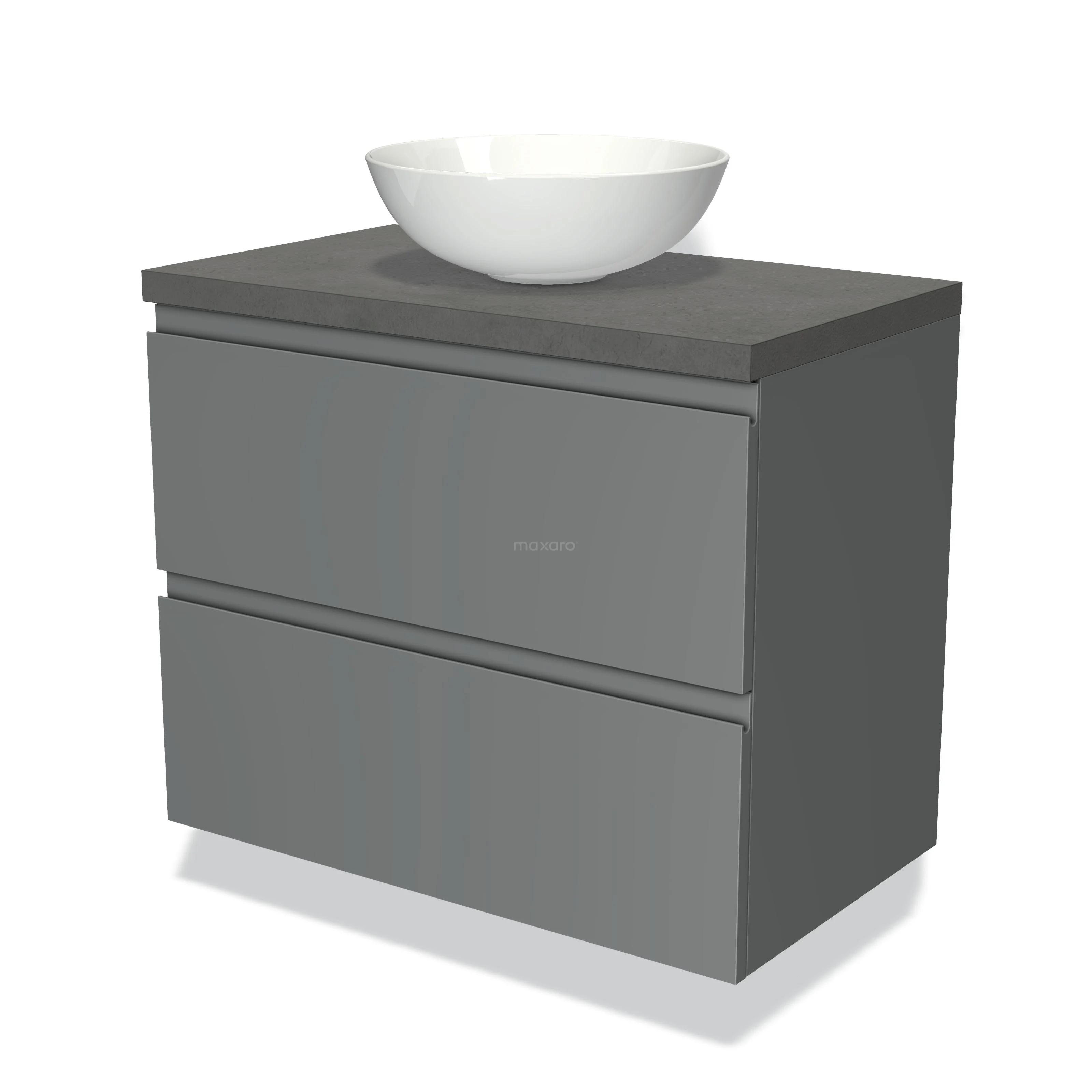 Modulo Plato Badmöbel mit Aufsatzwaschbecken | 80 cm Mittelgrau Grifflos front Dunkelgrauer Beton blatt 2 übereinanderliegende Schubladen