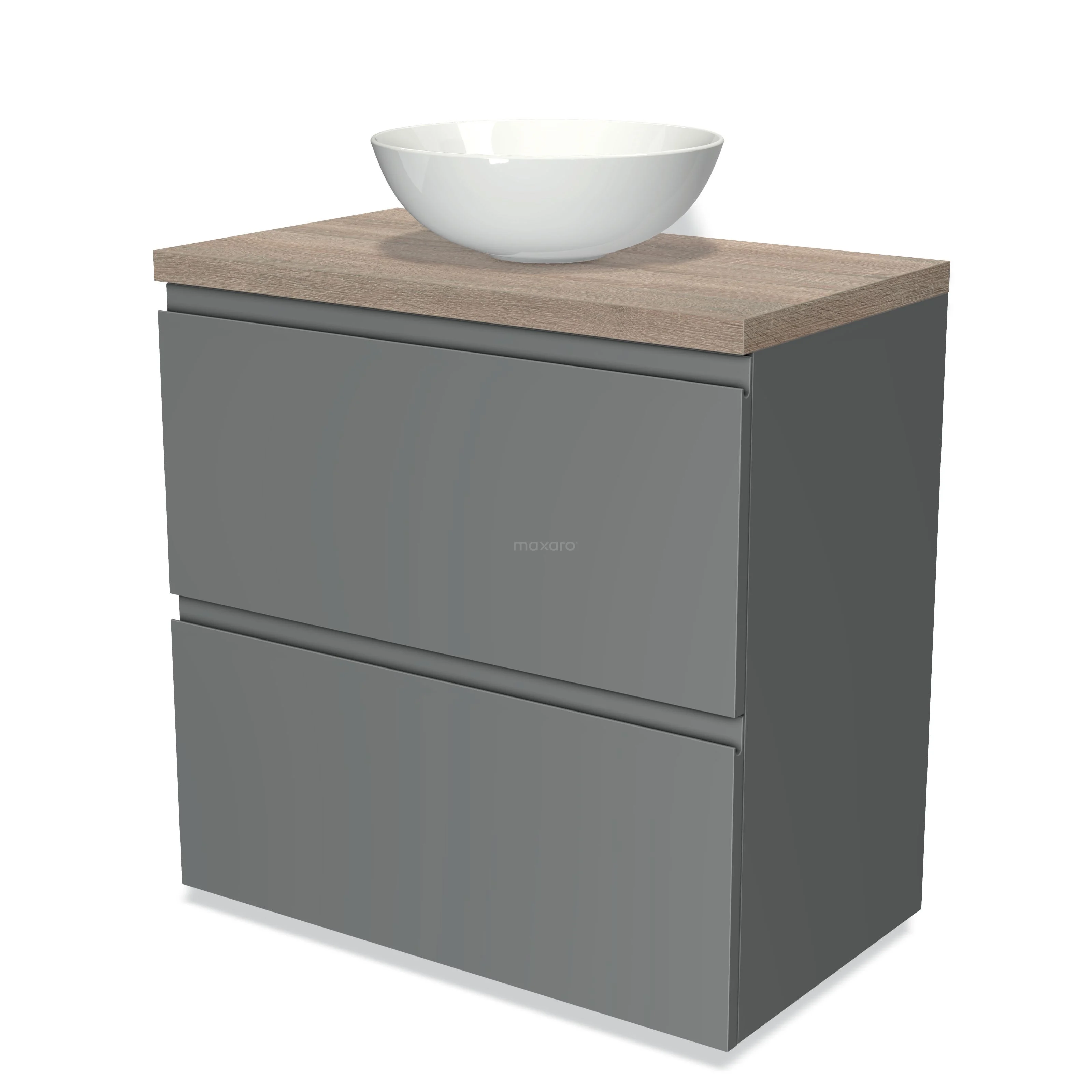 Modulo Plato Badmöbel mit Aufsatzwaschbecken | 80 cm Mittelgrau Grifflos front Eiche blatt 2 hohe Schubladen übereinanderliegend