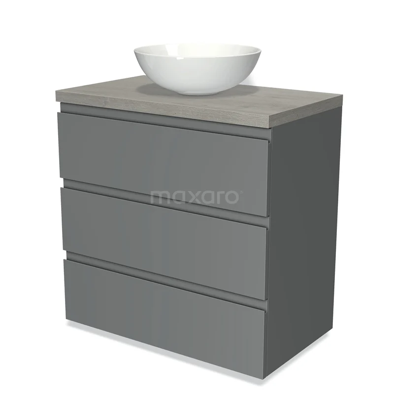Modulo Plato Badmöbel mit Aufsatzwaschbecken | 80 cm Mittelgrau Grifflos front Graue Eiche blatt 3 Schubladen