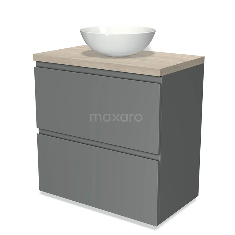 Modulo Plato Badmöbel mit Aufsatzwaschbecken | 80 cm Mittelgrau Grifflos front Hellgraue Eiche blatt 2 hohe Schubladen übereinanderliegend