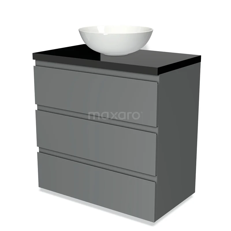 Modulo Plato Badmöbel mit Aufsatzwaschbecken | 80 cm Mittelgrau Grifflos front Hochglanz Schwarz blatt 3 Schubladen