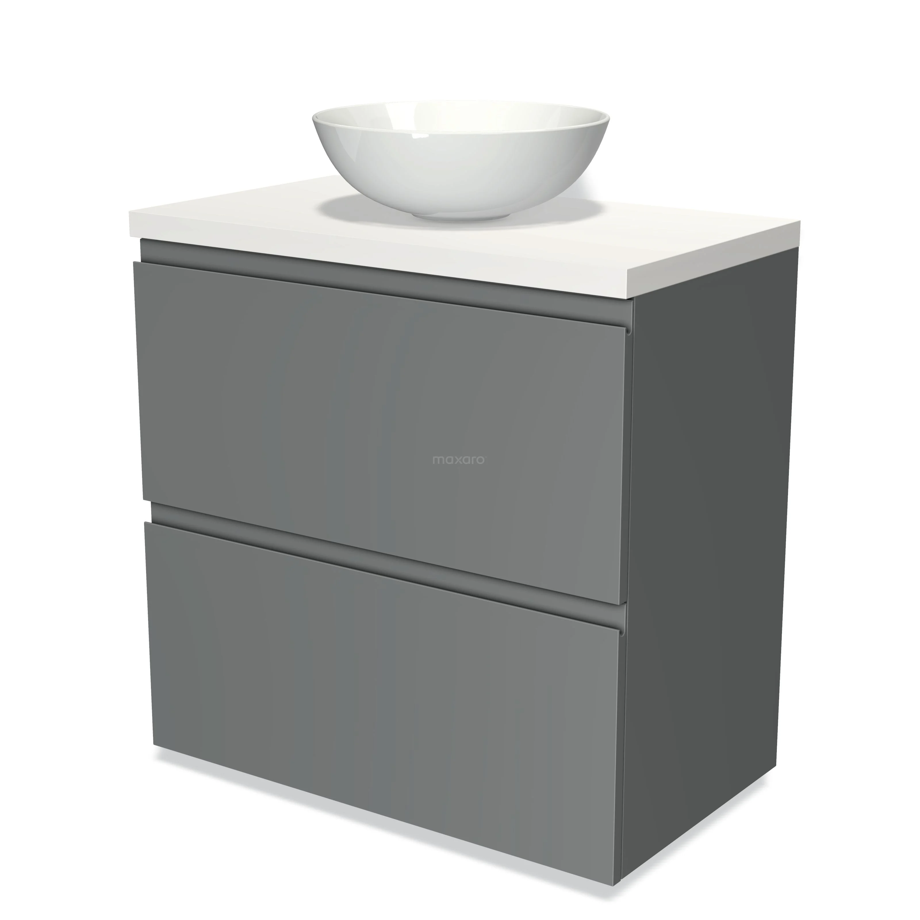 Modulo Plato Badmöbel mit Aufsatzwaschbecken | 80 cm Mittelgrau Grifflos front Matt Weiß blatt 2 hohe Schubladen übereinanderliegend