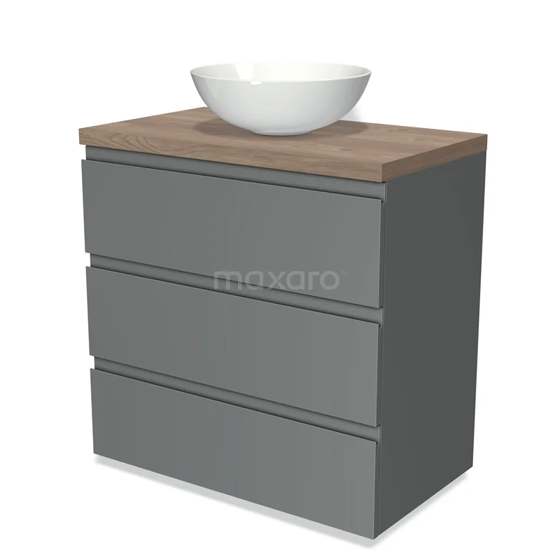 Modulo Plato Badmöbel mit Aufsatzwaschbecken | 80 cm Mittelgrau Grifflos front Mittelbraune Eiche blatt 3 Schubladen