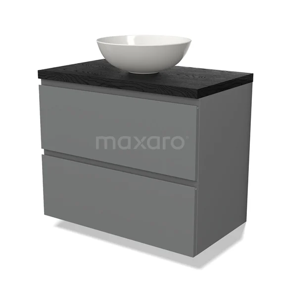 Modulo Plato Badmöbel mit Aufsatzwaschbecken | 80 cm Mittelgrau Grifflos front Schwarze Eiche blatt 2 übereinanderliegende Schubladen