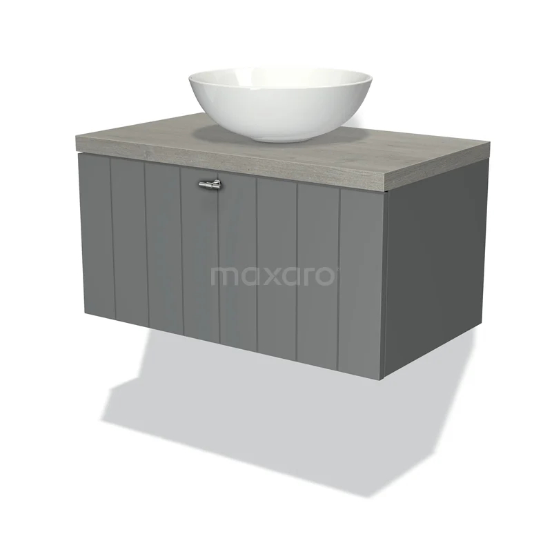 Modulo Plato Badmöbel mit Aufsatzwaschbecken | 80 cm Mittelgrau Lamelle front Graue Eiche blatt 1 Schublade
