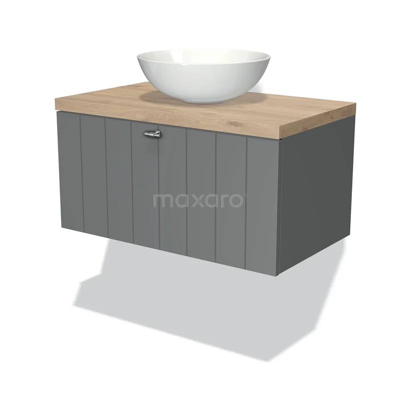 Modulo Plato Badmöbel mit Aufsatzwaschbecken | 80 cm Mittelgrau Lamelle front Hellbraune Eiche blatt 1 Schublade