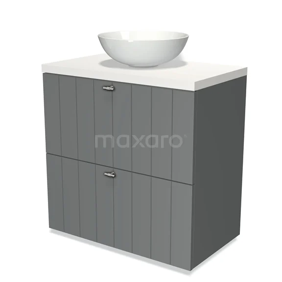 Modulo Plato Badmöbel mit Aufsatzwaschbecken | 80 cm Mittelgrau Lamelle front Matt Weiß blatt 2 hohe Schubladen übereinanderliegend
