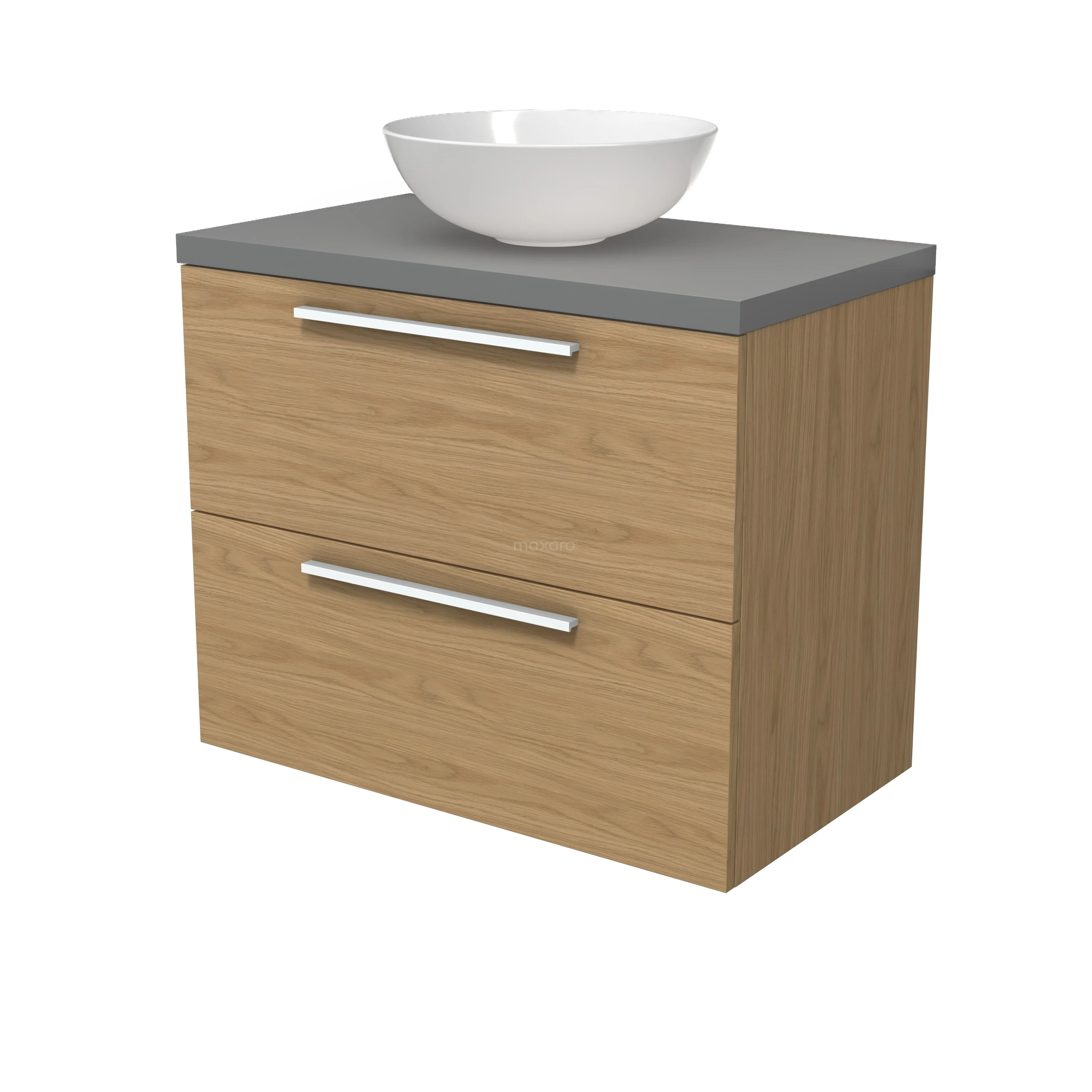 Modulo Plato Badmöbel mit Aufsatzwaschbecken | 80 cm Natürliches Furnier Flach front Mittelgrau blatt 2 übereinanderliegende Schubladen