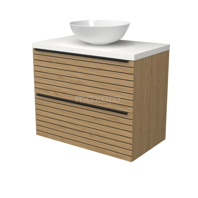 Modulo Plato Badmöbel mit Aufsatzwaschbecken | 80 cm Natürliches Furnier Streifen front Matt Weiß blatt 2 übereinanderliegende Schubladen BMK17-03158