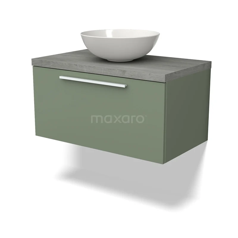 Modulo Plato Badmöbel mit Aufsatzwaschbecken | 80 cm Salbeigrün Flach front Graue Eiche blatt 1 Schublade