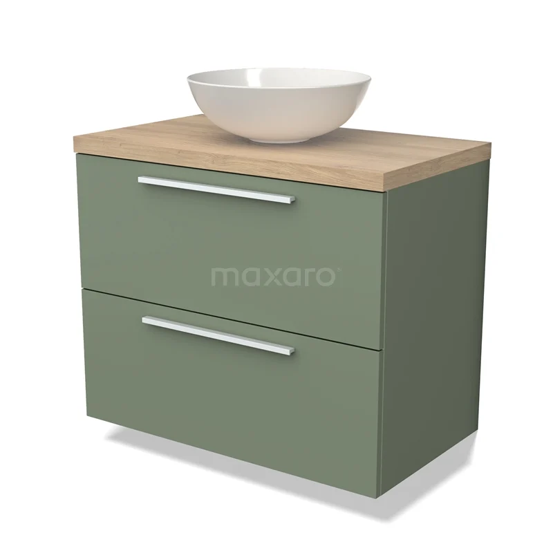 Modulo Plato Badmöbel mit Aufsatzwaschbecken | 80 cm Salbeigrün Flach front Hellbraune Eiche blatt 2 übereinanderliegende Schubladen