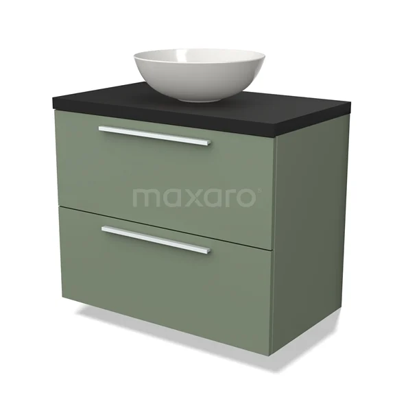 Modulo Plato Badmöbel mit Aufsatzwaschbecken | 80 cm Salbeigrün Flach front Matt Schwarz blatt 2 übereinanderliegende Schubladen
