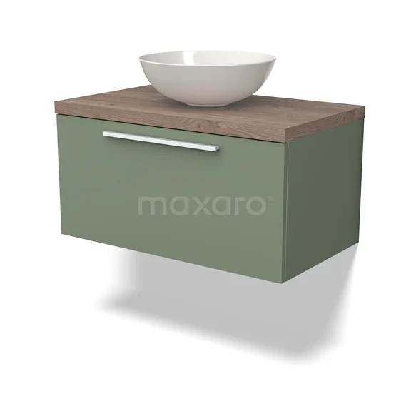 Modulo Plato Badmöbel mit Aufsatzwaschbecken | 80 cm Salbeigrün Flach front Mittelbraune Eiche blatt 1 Schublade