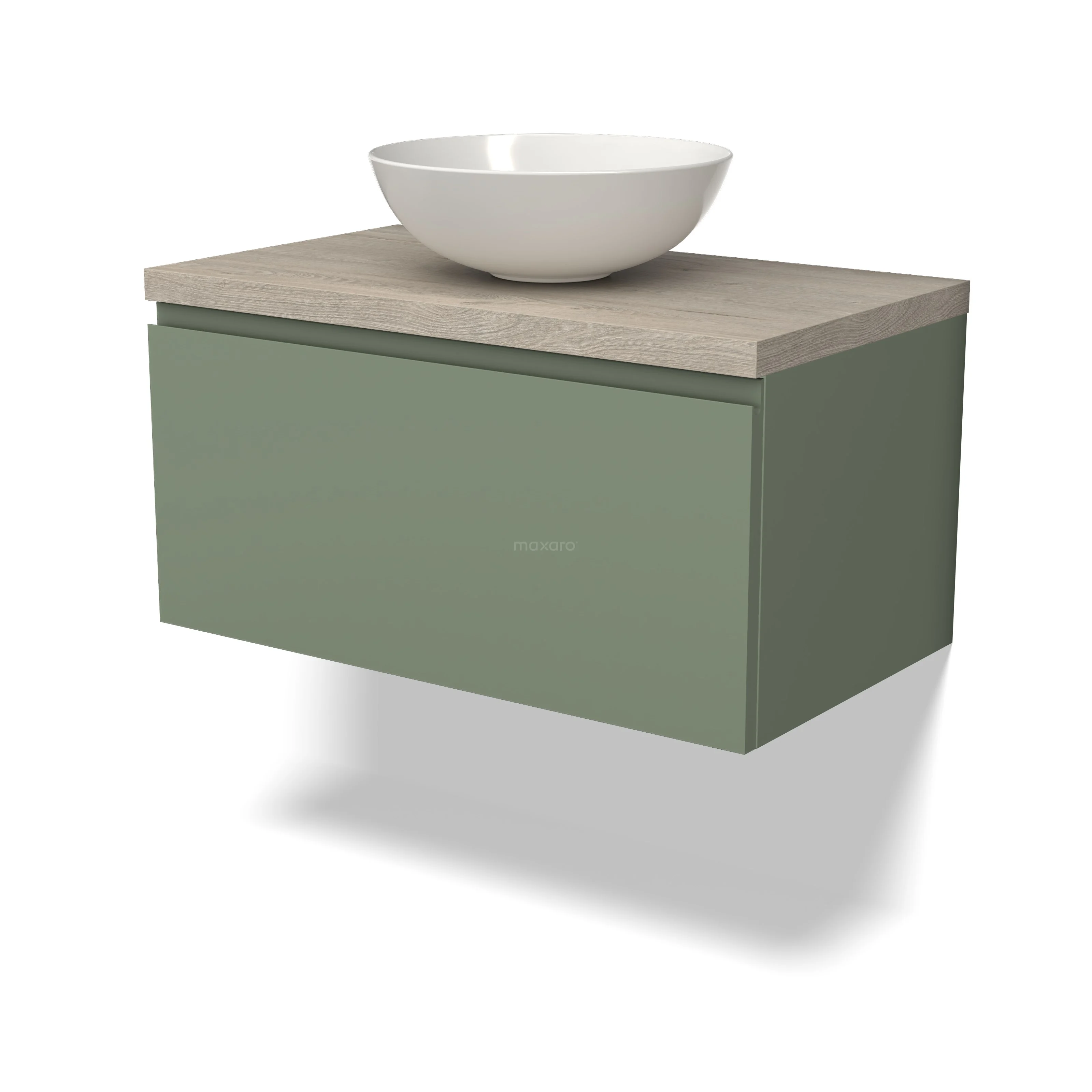 Modulo Plato Badmöbel mit Aufsatzwaschbecken | 80 cm Salbeigrün Grifflos front Hellgraue Eiche blatt 1 Schublade