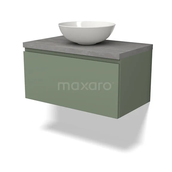 Modulo Plato Badmöbel mit Aufsatzwaschbecken | 80 cm Salbeigrün Grifflos front Hellgrauer Beton blatt 1 Schublade
