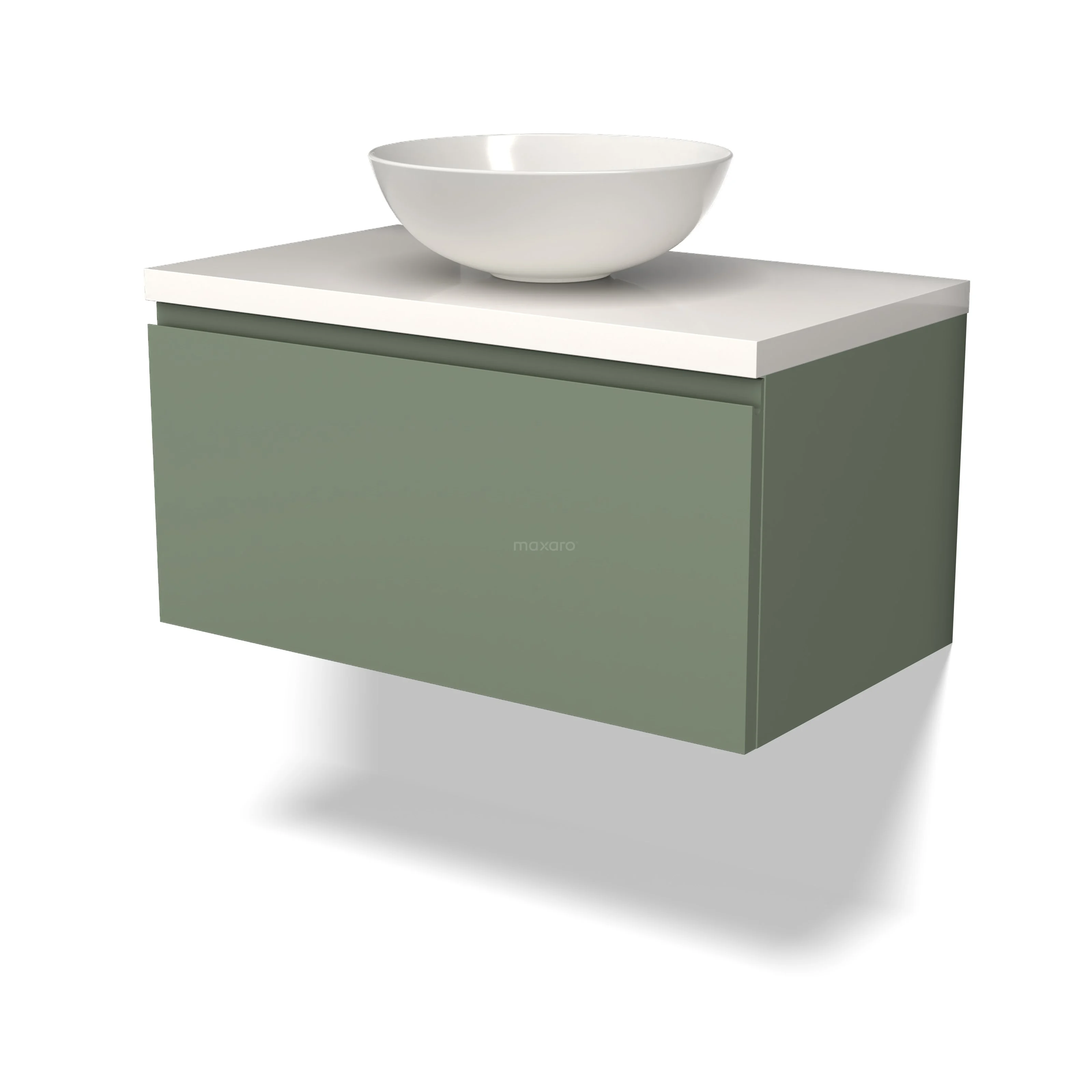 Modulo Plato Badmöbel mit Aufsatzwaschbecken | 80 cm Salbeigrün Grifflos front Hochglanz Weiß blatt 1 Schublade