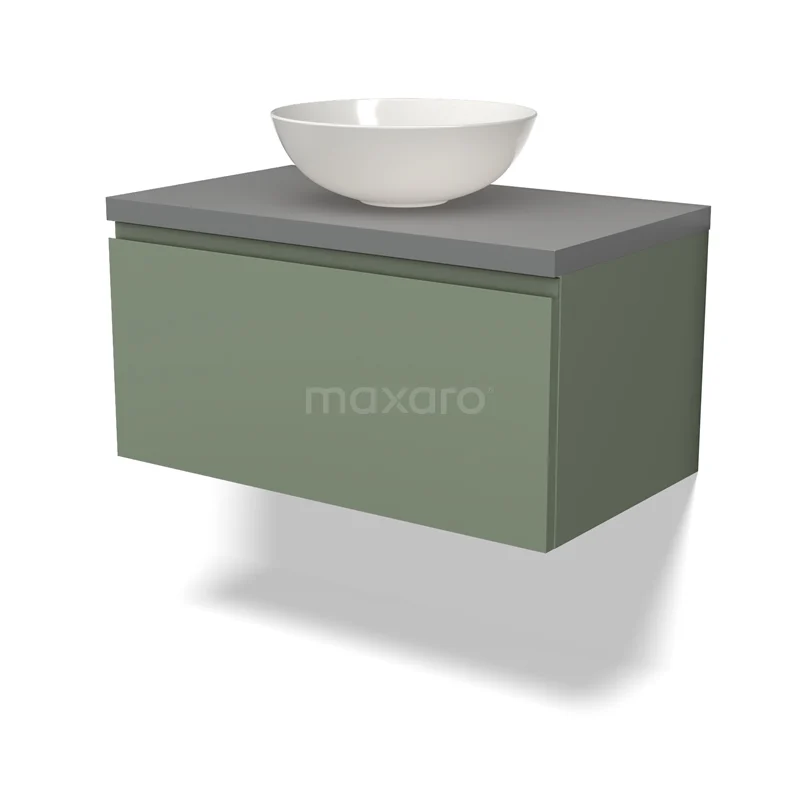 Modulo Plato Badmöbel mit Aufsatzwaschbecken | 80 cm Salbeigrün Grifflos front Mittelgrau blatt 1 Schublade