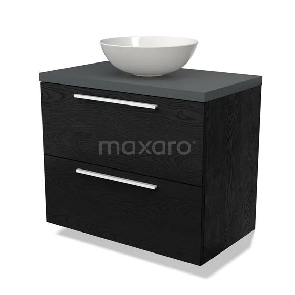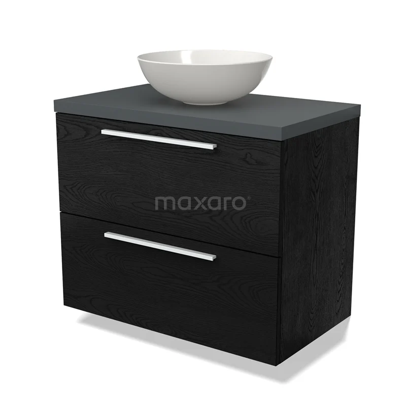 Modulo Plato Badmöbel mit Aufsatzwaschbecken | 80 cm Schwarze Eiche Flach front Dunkelgrau blatt 2 übereinanderliegende Schubladen