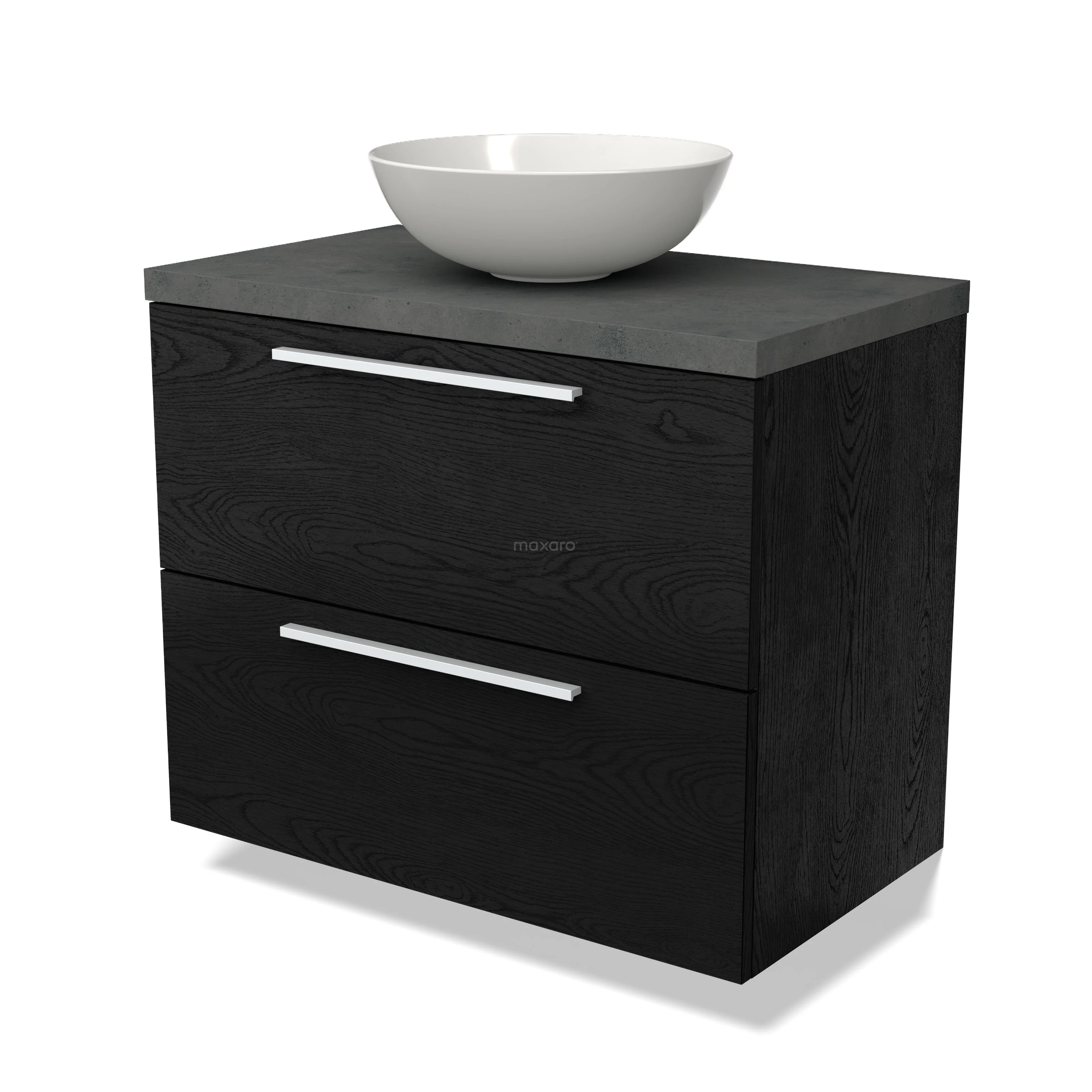 Modulo Plato Badmöbel mit Aufsatzwaschbecken | 80 cm Schwarze Eiche Flach front Dunkelgrauer Beton blatt 2 übereinanderliegende Schubladen