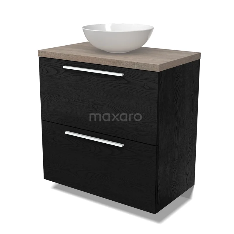 Modulo Plato Badmöbel mit Aufsatzwaschbecken | 80 cm Schwarze Eiche Flach front Eiche blatt 2 hohe Schubladen übereinanderliegend