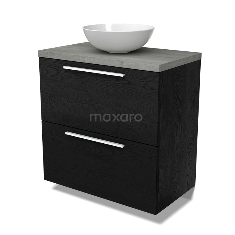 Modulo Plato Badmöbel mit Aufsatzwaschbecken | 80 cm Schwarze Eiche Flach front Graue Eiche blatt 2 hohe Schubladen übereinanderliegend