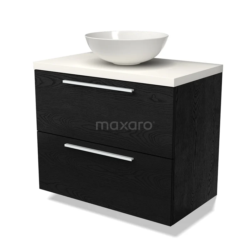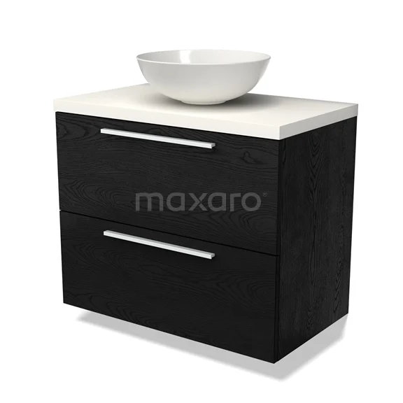 Modulo Plato Badmöbel mit Aufsatzwaschbecken | 80 cm Schwarze Eiche Flach front Matt Weiß blatt 2 übereinanderliegende Schubladen