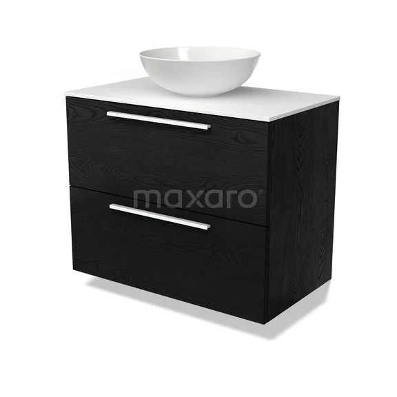 Modulo Plato Badmöbel mit Aufsatzwaschbecken | 80 cm Schwarze Eiche Flach front Solid Surface blatt 2 übereinanderliegende Schubladen
