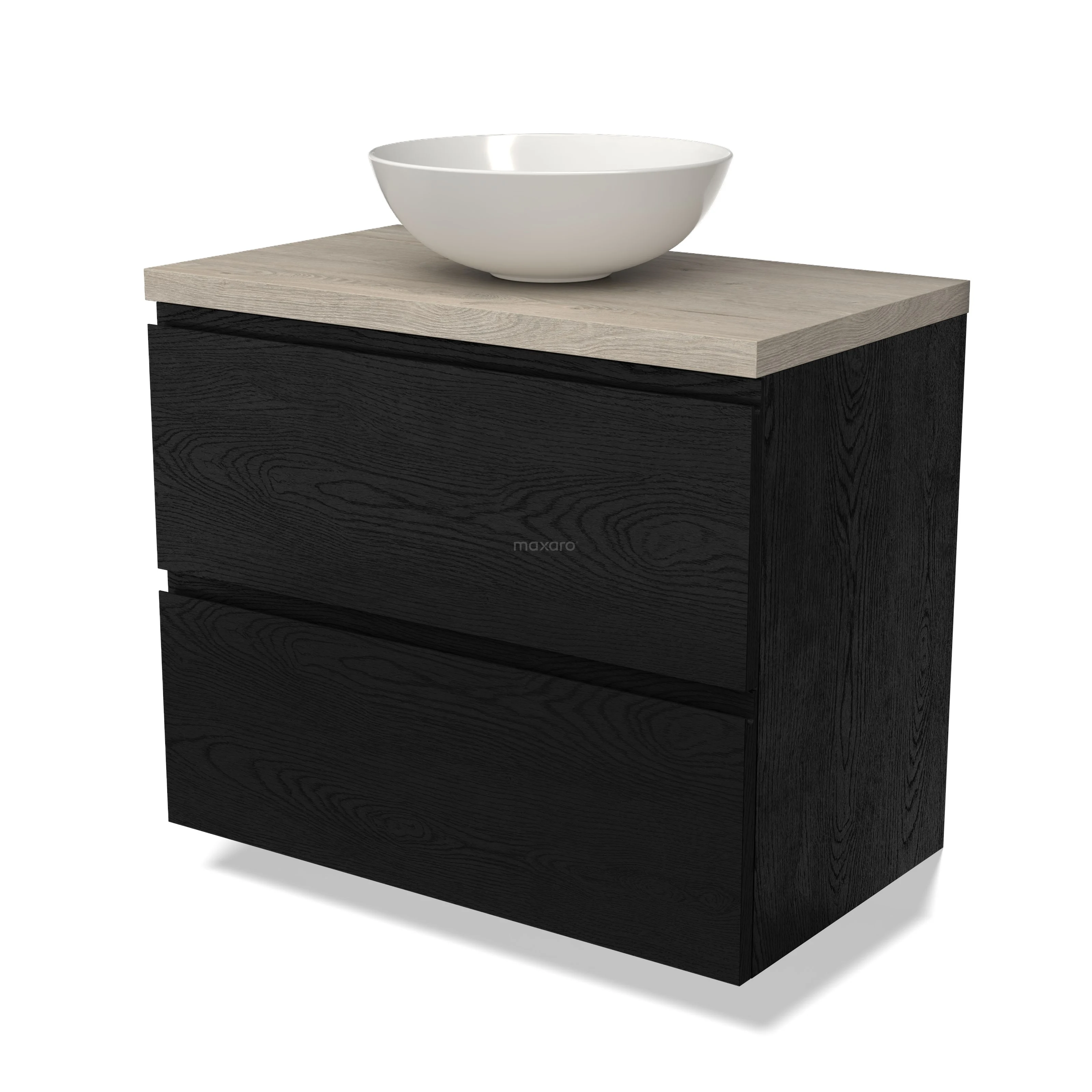 Modulo Plato Badmöbel mit Aufsatzwaschbecken | 80 cm Schwarze Eiche Grifflos front Hellgraue Eiche blatt 2 übereinanderliegende Schubladen