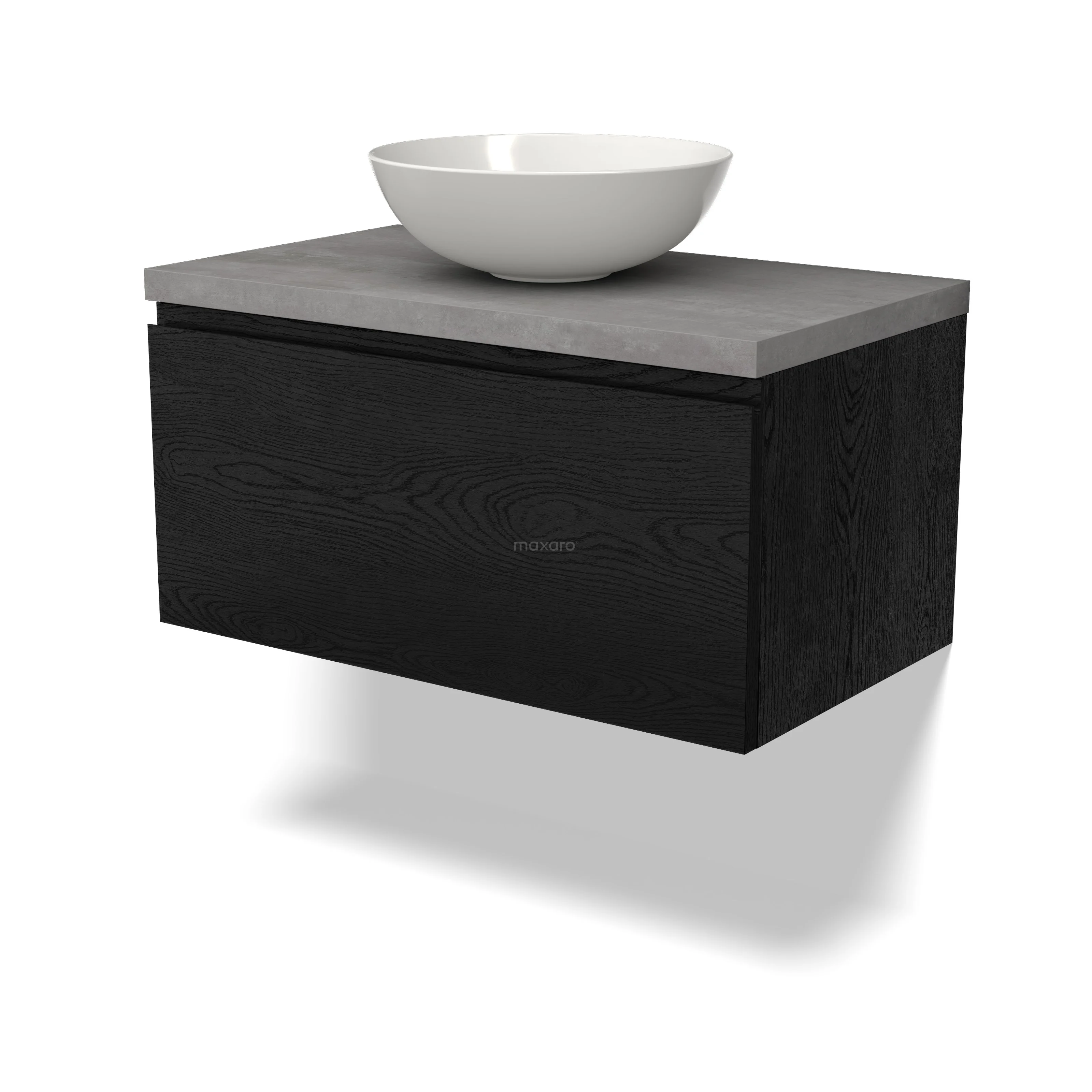 Modulo Plato Badmöbel mit Aufsatzwaschbecken | 80 cm Schwarze Eiche Grifflos front Hellgrauer Beton blatt 1 Schublade