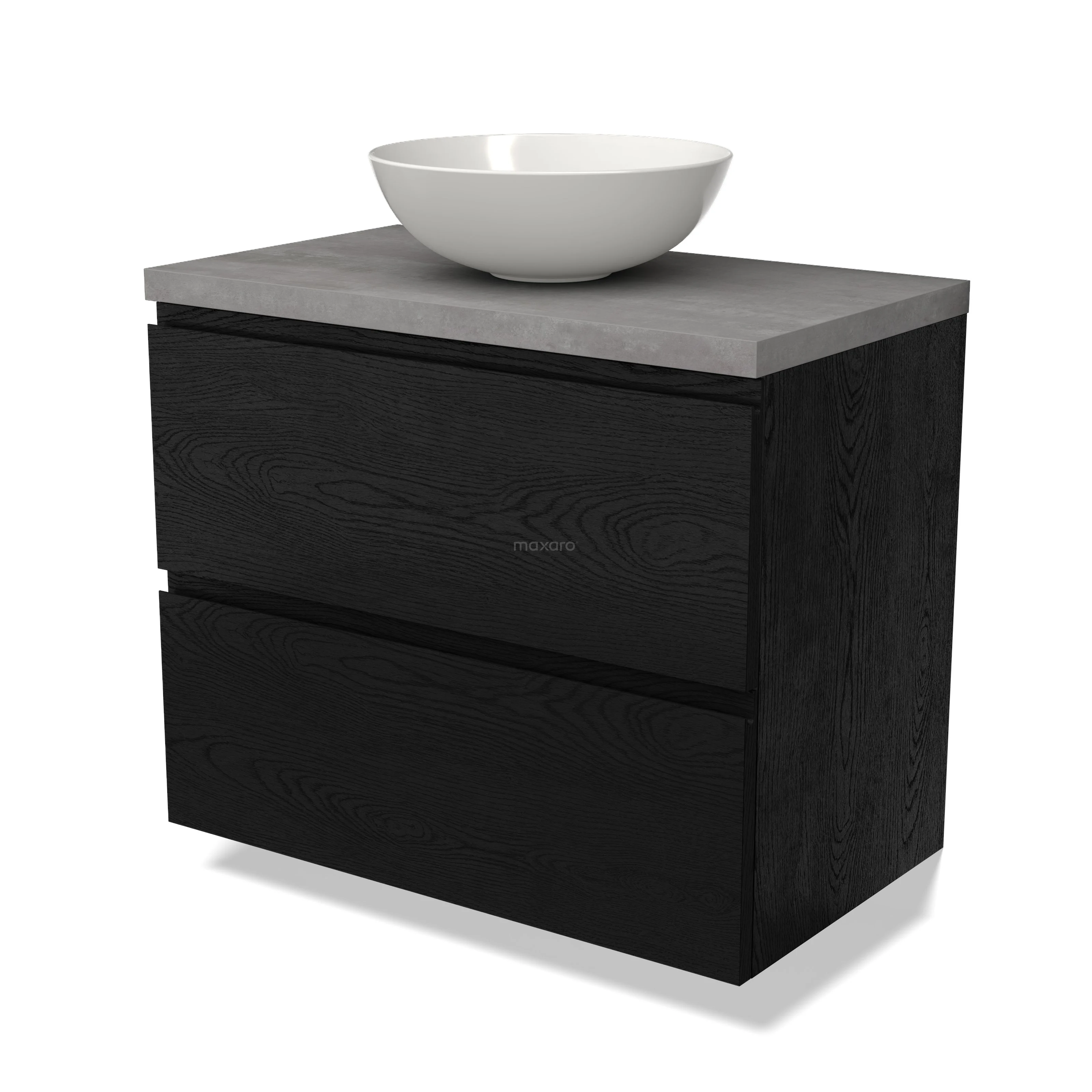 Modulo Plato Badmöbel mit Aufsatzwaschbecken | 80 cm Schwarze Eiche Grifflos front Hellgrauer Beton blatt 2 übereinanderliegende Schubladen