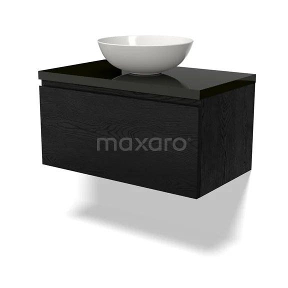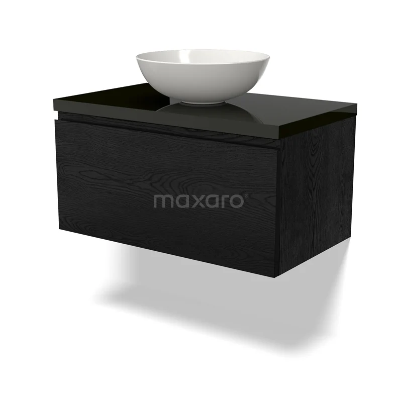 Modulo Plato Badmöbel mit Aufsatzwaschbecken | 80 cm Schwarze Eiche Grifflos front Hochglanz Schwarz blatt 1 Schublade
