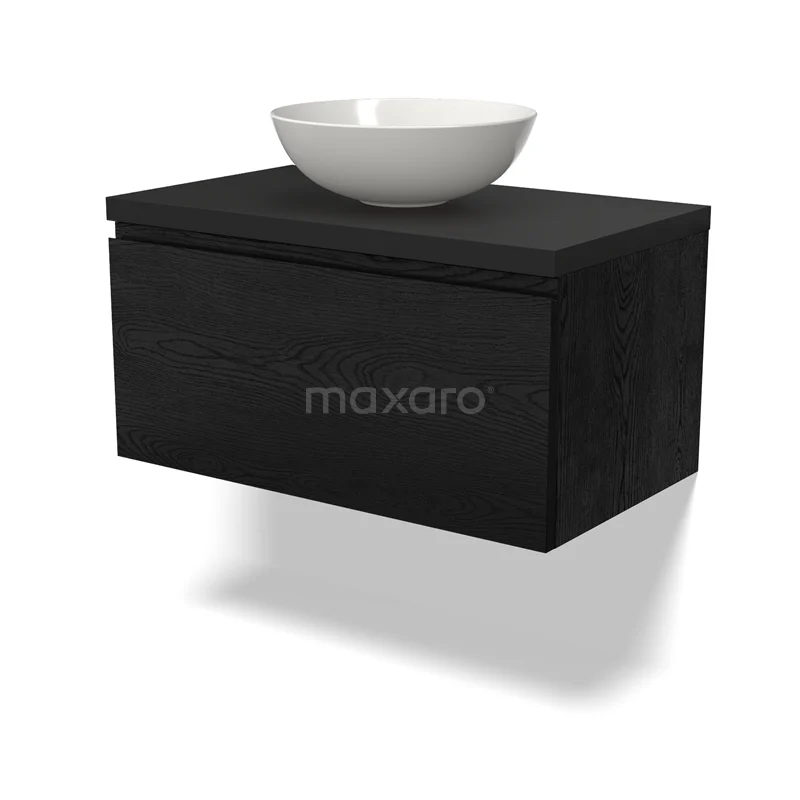 Modulo Plato Badmöbel mit Aufsatzwaschbecken | 80 cm Schwarze Eiche Grifflos front Matt Schwarz blatt 1 Schublade