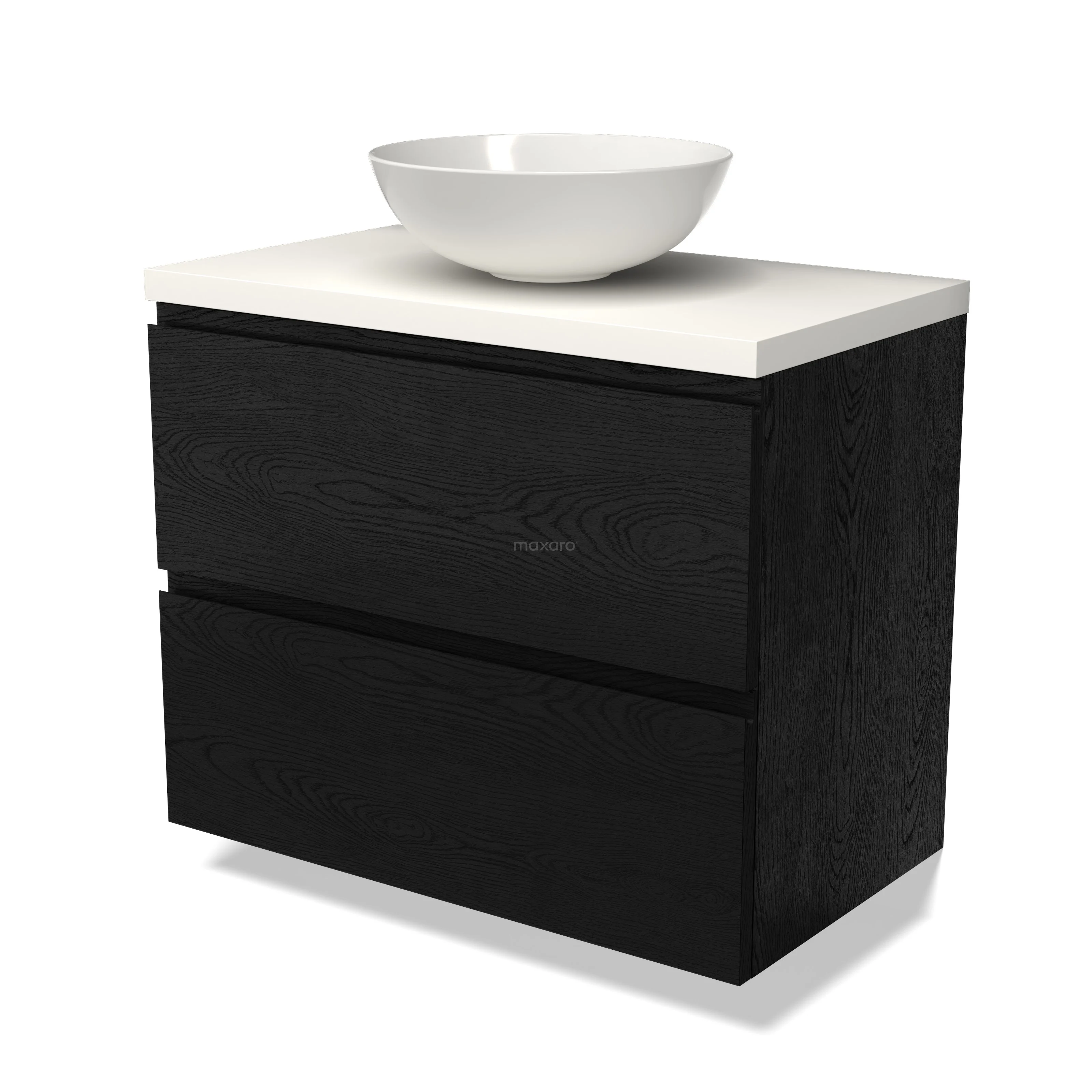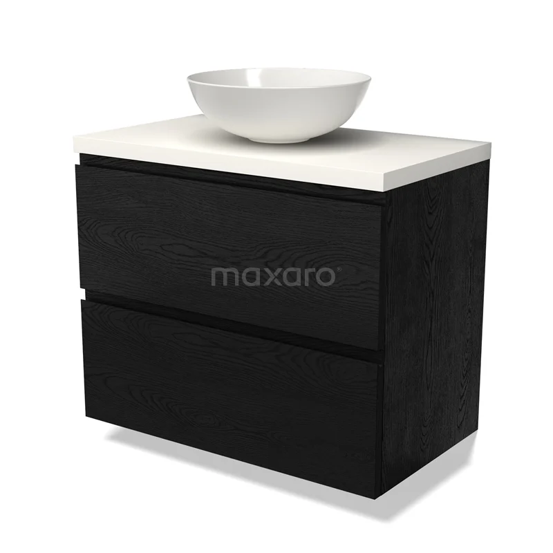 Modulo Plato Badmöbel mit Aufsatzwaschbecken | 80 cm Schwarze Eiche Grifflos front Matt Weiß blatt 2 übereinanderliegende Schubladen