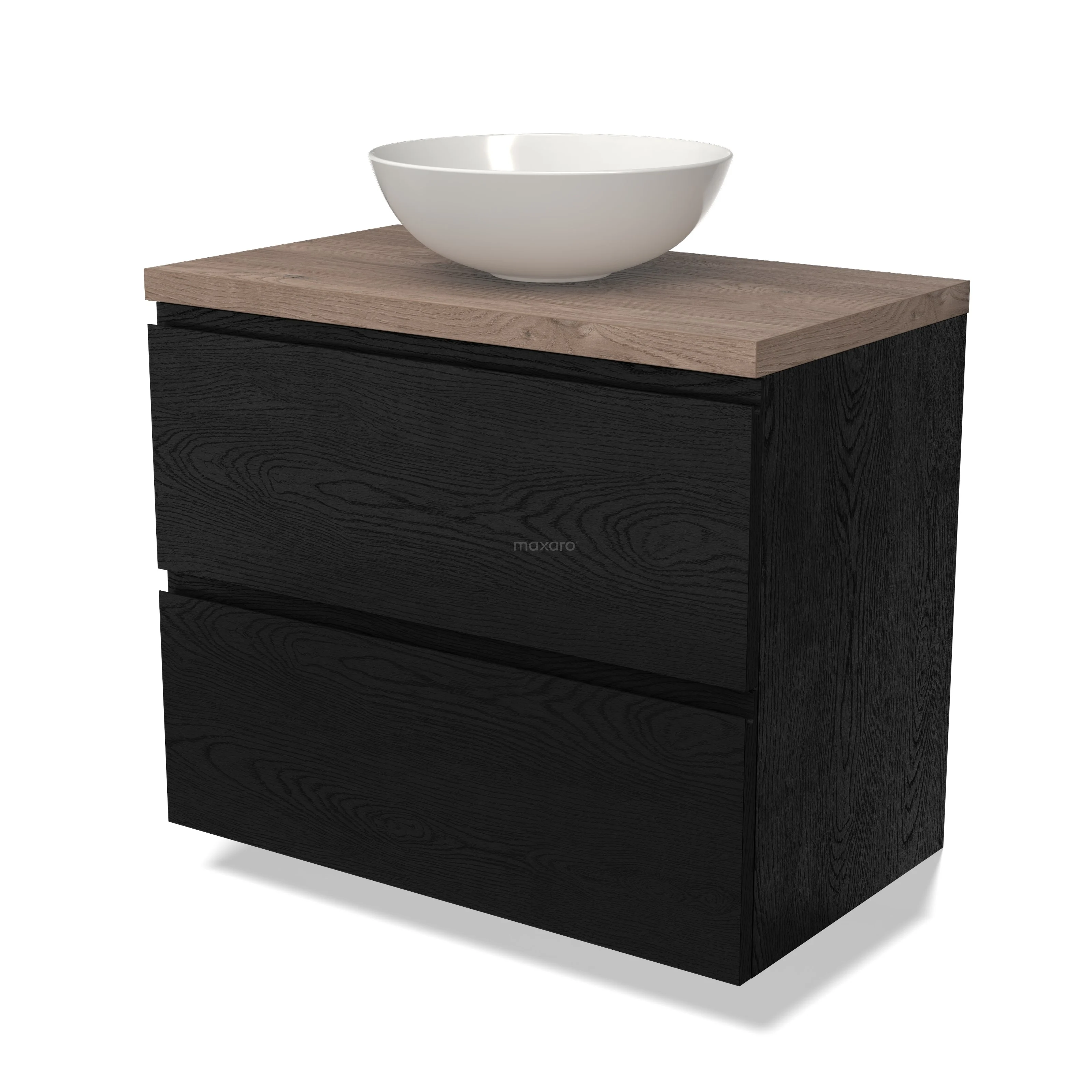 Modulo Plato Badmöbel mit Aufsatzwaschbecken | 80 cm Schwarze Eiche Grifflos front Mittelbraune Eiche blatt 2 übereinanderliegende Schubladen