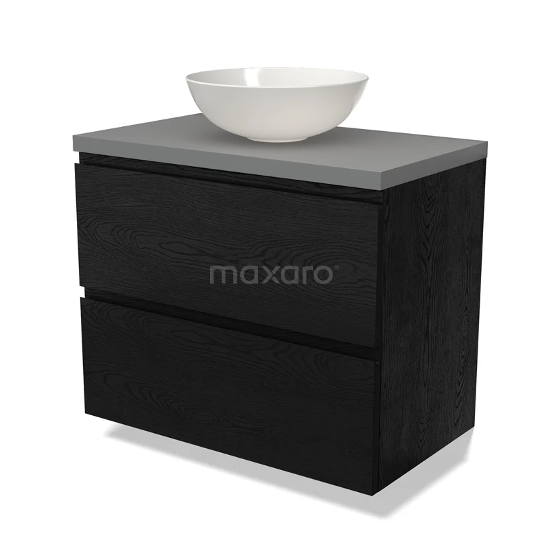 Modulo Plato Badmöbel mit Aufsatzwaschbecken | 80 cm Schwarze Eiche Grifflos front Mittelgrau blatt 2 übereinanderliegende Schubladen