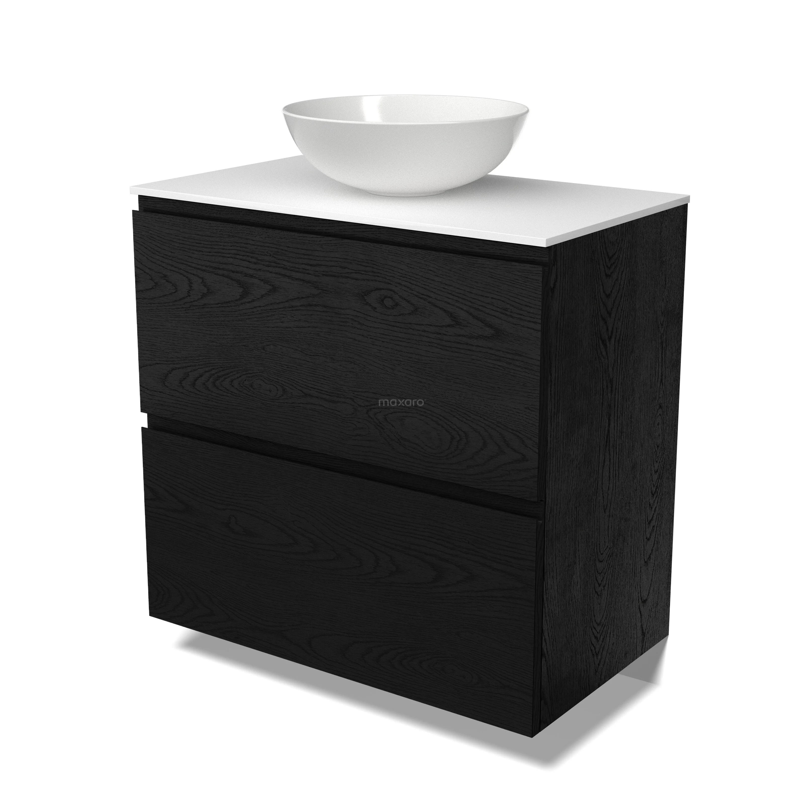 Modulo Plato Badmöbel mit Aufsatzwaschbecken | 80 cm Schwarze Eiche Grifflos front Solid Surface blatt 2 hohe Schubladen übereinanderliegend