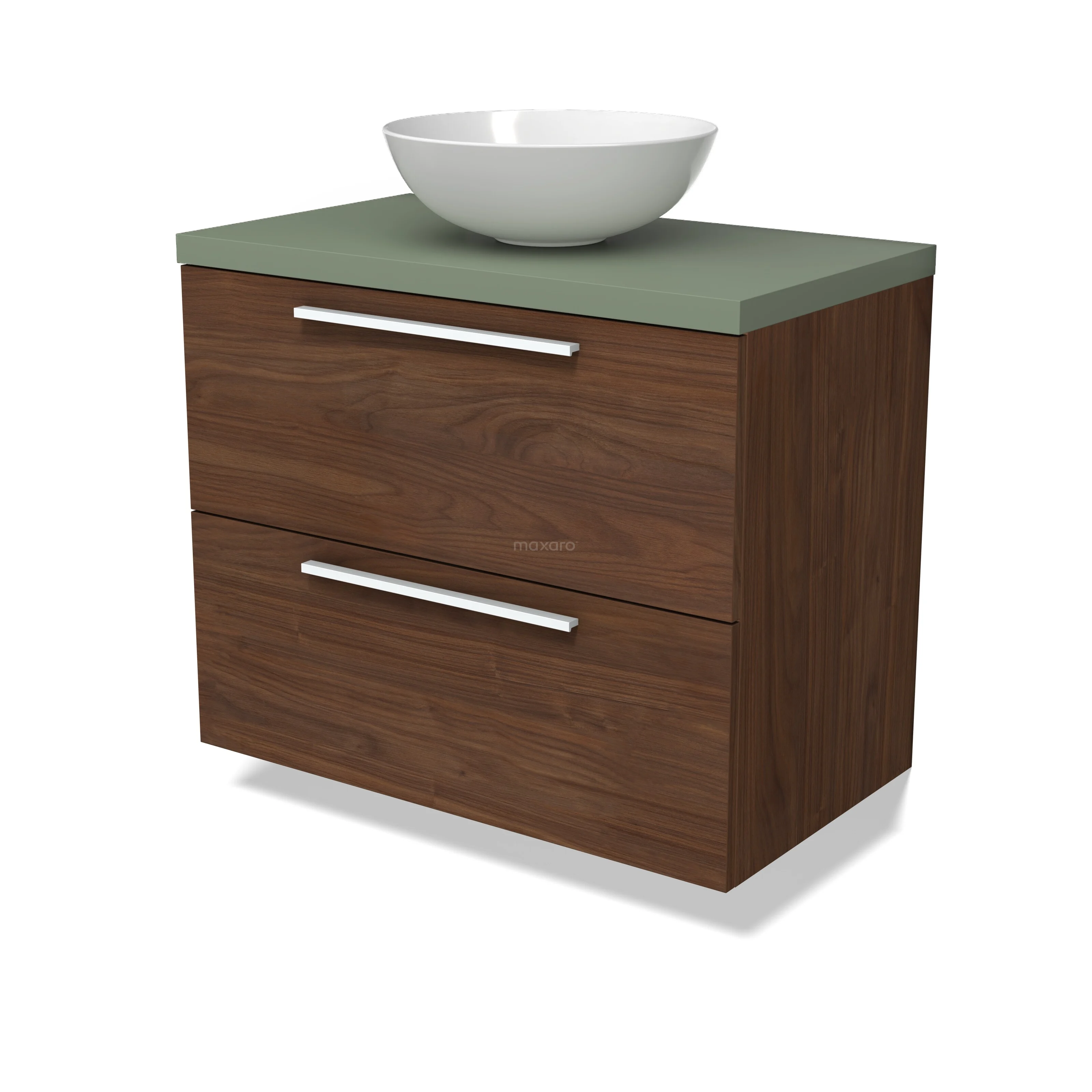 Modulo Plato Badmöbel mit Aufsatzwaschbecken | 80 cm Walnuss Flach front Salbeigrün blatt 2 übereinanderliegende Schubladen