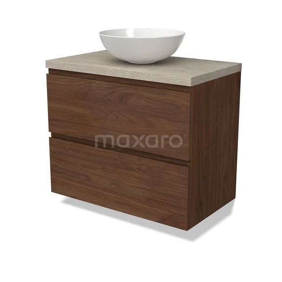 Modulo Plato Badmöbel mit Aufsatzwaschbecken | 80 cm Walnuss Grifflos front Hellgraue Eiche blatt 2 übereinanderliegende Schubladen