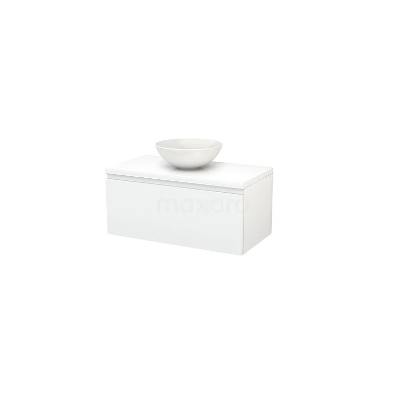 Modulo+ Plato Badmöbel mit Aufsatzwaschbecken | 90 cm Hochglanz Weiß Grifflos front Hochglanz Weiß blatt 1 Schublade